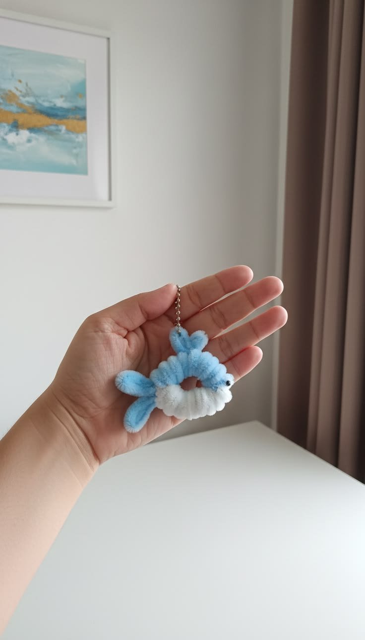 Soft and adorable dolphin keychain handcrafted with fluffy pipe cleaners in dreamy blue and white shades. A cute aesthetic charm perfect for bags, keys, and gifting.